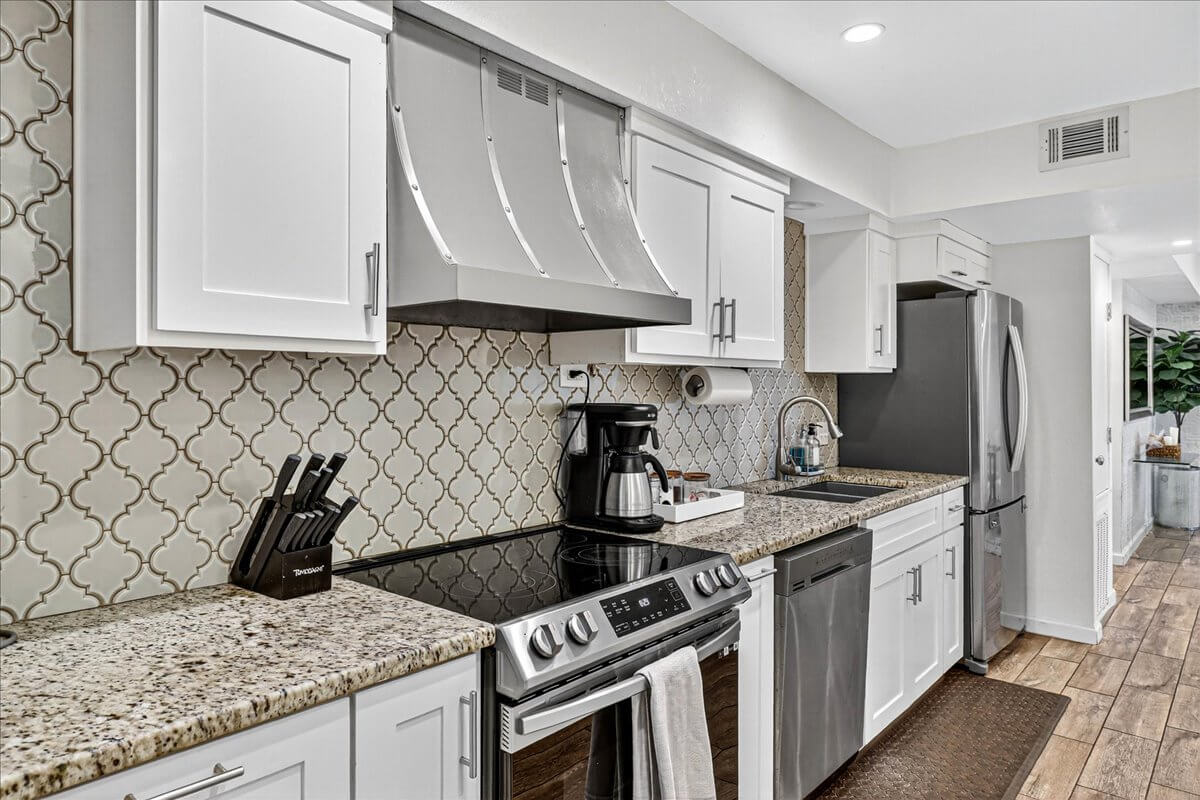 Newly renovated kitchen with all brand new appliances, a multi-burner electric stove, modern back splash and a high-end granite counter top and a breakfast bar with seating for four. Fully equipped, comes with: