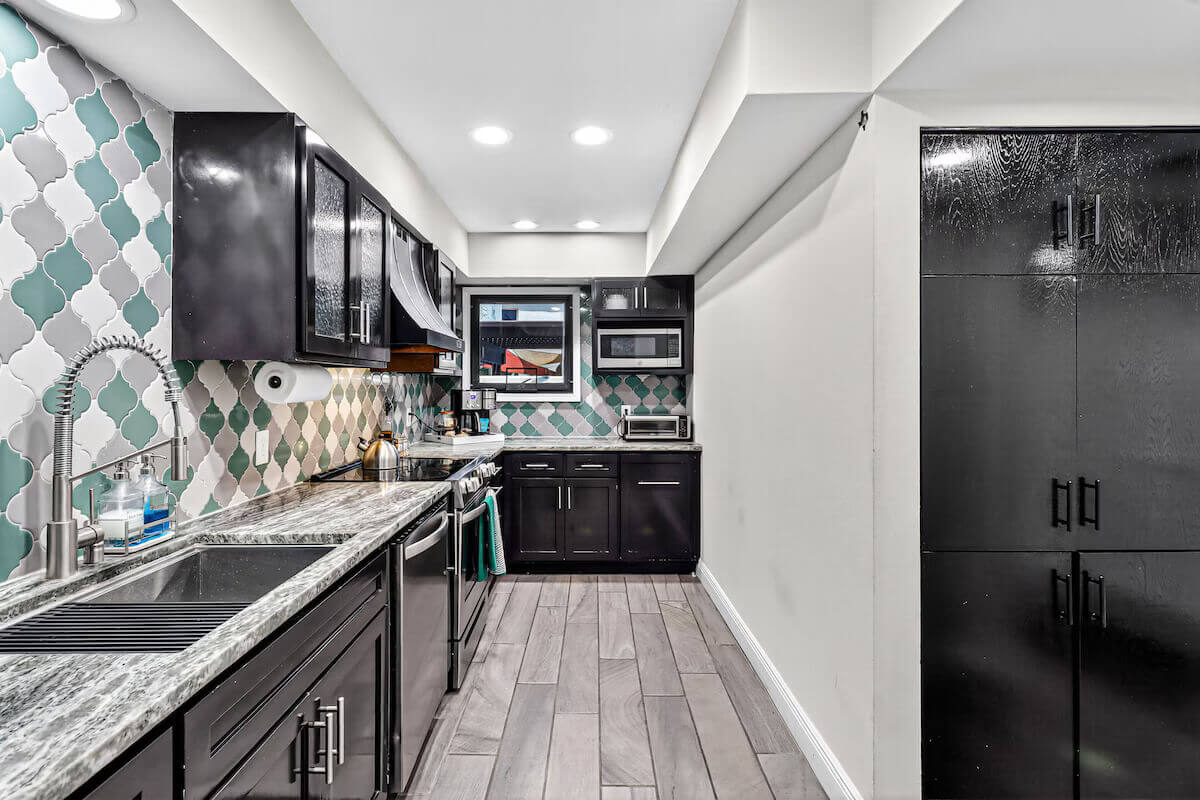 Newly renovated kitchen with all brand new appliances, a multi-burner electric stove, modern back splash and a high-end granite counter top and a breakfast bar with seating for four. Fully equipped, comes with: